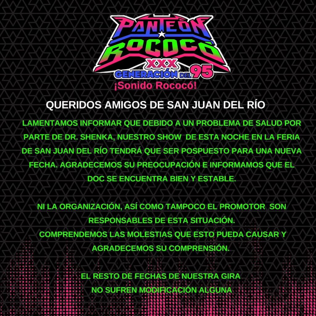 “Lamentamos informar que debido a un problema de salud por parte de Dr. Shenka, nuestro show tendrá que ser pospuesto”, informó la banda panteón Rococó a través de sus redes sociales.